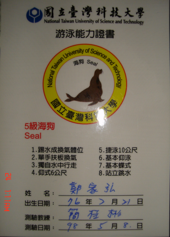 95.11.22.體育室九十五學年度第5次室務會議通過 一、宗旨:為提倡本校游泳運動風氣,提升游泳技術能力,促進游泳教學效益, 二、檢測對象:本校學生、專兼任、退休、離職之教職員工及其眷屬,校務基金專 三、檢測標準: 四、申請手續: 五、檢測日期: 六、游泳能力證書,如不慎遺失時,請即時掛失,並須繳交手續費100元,重新申請證書。 七、本辦法經體育室室務會議通過並經校長核定後施行,修正時亦同。 |